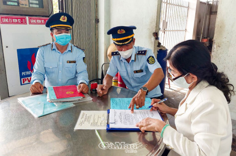 | Đoàn kiểm tra Cục Quản lý thị trường tiến hành kiểm tra và hướng dẫn đại diện Doanh nghiệp xăng dầu Phúc Lộc (xã An Xuyên, TP Cà Mau) ký cam kết kinh doanh xăng dầu khi còn hàng và bán đúng giá theo quy định. |