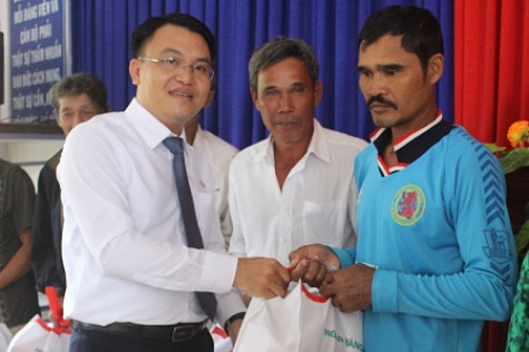 Ông Mạc Quốc Phong, Giám đốc Kienlongbank Cà Mau trao cho bà con nghèo ở xã Tân Dân, huyện Đầm Dơi.