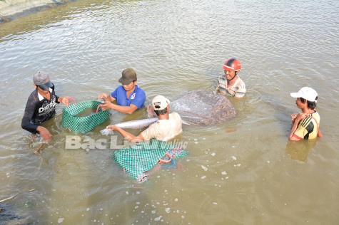 Nông dân huyện Đông Hải thu hoạch tôm công nghiệp.