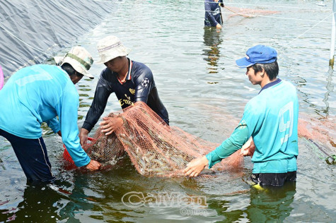 | Thu hoạch tôm trong ao trải bạt ở xã Trần Phán, huyện Đầm Dơi. Ảnh: Nguyễn Phú |