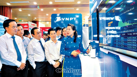 | Ðồng chí Huỳnh Quốc Việt (thứ hai từ trái sang), Uỷ viên dự khuyết BCH Trung ương Ðảng, Phó bí thư Tỉnh uỷ, Chủ tịch UBND tỉnh, Trưởng ban Chỉ đạo Chuyển đổi số tỉnh, cùng các đại biểu tham dự Chương trình “Cà Mau hưởng ứng Ngày Chuyển đổi số quốc gia 10/10/2022”. Ảnh: HỒNG NHUNG |