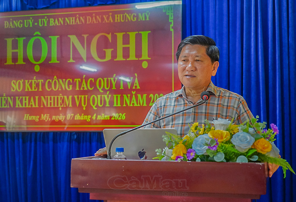 Báo Cà Mau Phát biểu tại hội nghị sơ kết công tác quý I, triển khai nhiệm vụ quý II năm 2026 tại xã Hưng Mỹ, Phó Chủ tịch UBND tỉnh Lê Văn Sử ghi nhận và đánh giá cao những kết quả mà xã đạt được trong quý I/2026, nhất là trong bối cảnh địa phương phải triển khai đồng thời nhiều nhiệm vụ phát sinh nhưng vẫn hoàn thành tốt các chỉ tiêu đề ra, với nhiều điểm sáng về phát triển kinh tế - xã hội.