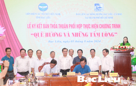 Chiều 5/8, tại TP. Bạc Liêu, trước sự chứng kiến của ông Ngô Vũ Thăng - Phó Chủ tịch UBND tỉnh Bạc Liêu, Liên hiệp các Tổ chức hữu nghị tỉnh và Ban Liên lạc đồng hương Bạc Liêu - Cà Mau tại TP. Hồ Chí Minh (gọi tắt Ban Liên lạc) đã ký kết bản thỏa thuận phối hợp thực hiện chương trình “Quê hương và những tấm lòng” lần thứ III - năm 2024 - (ảnh).