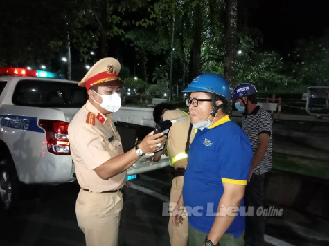 Cảnh sát giao thông TP. Bạc Liêu kiểm tra nồng độ cồn người điều khiển phương tiện giao thông đường bộ. Ảnh: T.H