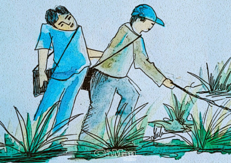 Vậy rồi, mấy bà, mấy cô xúm lại mua báo ào ào, tôi bán cái vèo sạch trơn, chỉ chừa lại cho cơ quan xã mấy tờ. Tôi lần theo hướng Mười Ðại và anh kia một đoạn thì nghe hai người vừa kêu, vừa ngoắt tôi vô căn nhà lá nền đất có mái hiên mát mẻ. Chỗ đó trên bộ vạc cau, bốn năm người cười nói râm ran. Ở giữa, trên tàu lá chuối có con cá lóc to bằng bắp chân nướng rơm, kế bên là mớ rau cần nước và chai rượu đế trong như mắt mèo, nút bằng lá chuối khô. Rượu rót tràn ly vô "trăm phần trăm mấy vòng, Mười Ðại nhìn qua tôi: "Thằng này em bà con với tao, tên Trải, hồi trước đi Ðoàn Văn công Cà Mau, giờ vừa làm ruộng, hụ hợ thông tin văn hoá xã". Anh tên Trải tiếp lời: "Xứ mình hồi đó chiến tranh đâu ai bán báo, đâu như ngoài chợ báo báo đây là có ngươi mua ào ào. Phải Sơn Ðông mãi võ dị mới bán được. Thôi, vô cái nữa nghen".