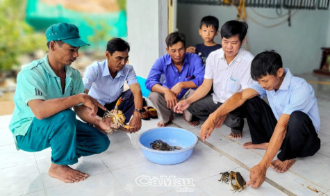 | Ông Bộ (bìa phải) chia sẻ hiệu quả mô hình nuôi cua cho bà con. |