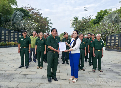 Bà Đoàn Hồng Lĩnh, Chủ tịch Uỷ ban MTTQ Việt Nam phường Bạc Liêu, trao Quyết định thành lập Câu lạc bộ "Thắp hương tri ân các anh hùng liệt sĩ".