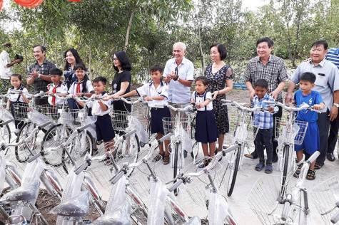 Các mạnh thường quân trao xe đạp cho học sinh nghèo trên địa bàn huyện. |