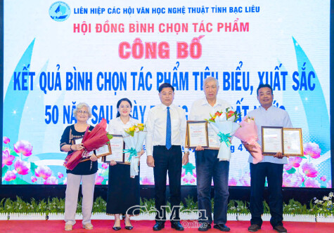 Ông Thạch Đờ Ni, Chi hội trưởng Chi hội VHNT các Dân tộc (bìa phải), nhận khen thưởng tác phẩm tiêu biểu, xuất sắc 50 năm sau ngày thống nhất đất nước, do Liên hiệp các Hội VHNT tỉnh Bạc Liêu bình chọn.
