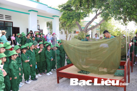Ngay trong khuôn viên của đơn vị, giáo viên, học sinh trường cùng giao lưu văn nghệ với người lính, nghe giới thiệu về chức năng, nhiệm vụ của BĐBP. Trong không khí sôi nổi, hào hứng, các em học sinh mặc trang phục màu xanh áo lính, đội mũ tai bèo và được trải nghiệm một ngày làm bộ đội thông qua hướng dẫn của cán bộ, chiến sĩ Đồn Biên phòng. Các hoạt động được bắt đầu và kết thúc bằng tiếng còi hiệu lệnh quen thuộc của quân đội. Qua cách dẫn chương trình vui tươi, dí dỏm của Thượng úy Lê Văn Giàu, 80 em học sinh háo hức xem và thực hành cách sắp xếp nội vụ (mùng mền) cũng như thực hành các động tác điều lệnh quân đội. Ngay sau đó, những “cô, chú bộ đội nhí” được thỏa sức tham quan, thực hành tại khu vực tăng gia sản xuất là vườn rau, ao cá của Đồn Biên phòng.