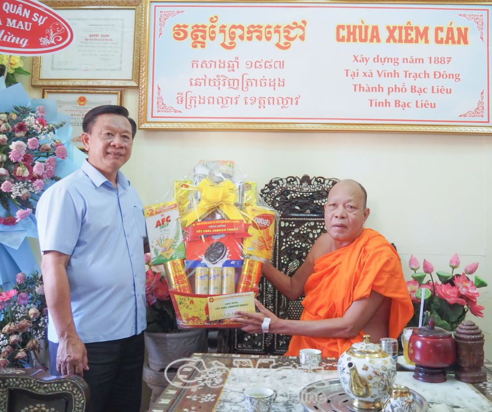 Đồng chí Hồ Trung Việt, Trưởng Ban Tuyên giáo và Dân vận Tỉnh uỷ, tặng quà Tết các vị sư và Ban quản trị chùa Xiêm Cán.