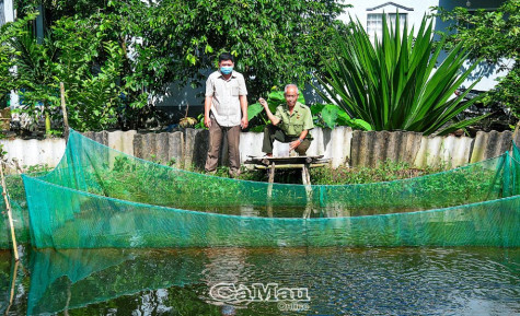 | Hộ ông Ðỗ Tấn Ðức (người ngồi), Ấp 11, xã Nguyễn Phích tận dụng đất trống xung quanh nhà trồng cây ăn trái và nuôi cá nước ngọt, cải thiện đời sống, vươn lên thoát nghèo. |
