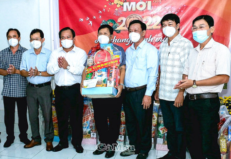 | Uỷ viên BTV Tỉnh uỷ, Trưởng Ban Tuyên giáo Tỉnh uỷ Cà Mau Hồ Trung Việt (thứ 3 từ phải qua) và Phó chủ tịch UBND tỉnh Nguyễn Minh Luân (thứ 3 từ trái sang) tặng quà, chúc Tết Ban biên tập Báo Cà Mau. |