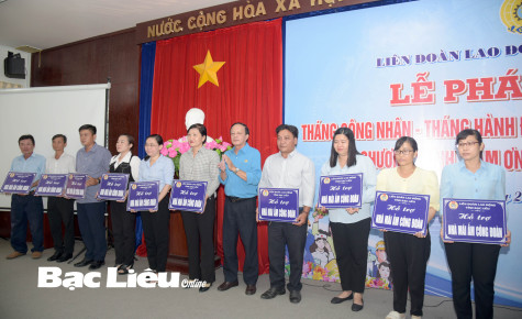 Dịp này, LĐLĐ tỉnh Bạc Liêu đã trao tặng 20 suất quà cho những công nhân tiêu biểu; trao 50 phần quà (mỗi suất trị giá 1 triệu đồng) cho công nhân lao động có hoàn cảnh khó khăn, trong đó có 10 suất quà từ nhà tài trợ Bệnh viên Quốc tế Phương Châu - Sóc Trăng; trao bảng tượng trưng hỗ trợ xây dựng 10 Mái ấm Công đoàn cho đoàn viên khó khăn về nhà ở (mỗi căn được hỗ trợ 50 triệu đồng).