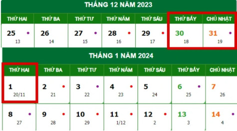 Tết Dương lịch 2024 (1/1/2024) rơi vào thứ Hai. Còn các ngày 30 và 31/12/2023 rơi vào thứ Bảy và Chủ nhật.