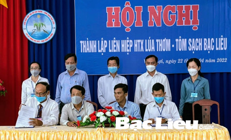 Liên hiệp HTX Lúa thơm - Tôm sạch Bạc Liêu ký hợp đồng với các công ty, doanh nghiệp cung ứng vật tư đầu vào và bao tiêu đầu ra cho sản phẩm.