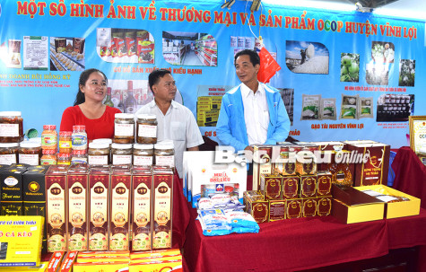 Các sản phẩm OCOP của huyện Vĩnh Lợi tham gia Hội chợ Công nghiệp - Thương mại và Triển lãm sản phẩm OCOP Bạc Liêu năm 2020. Ảnh: T.Q