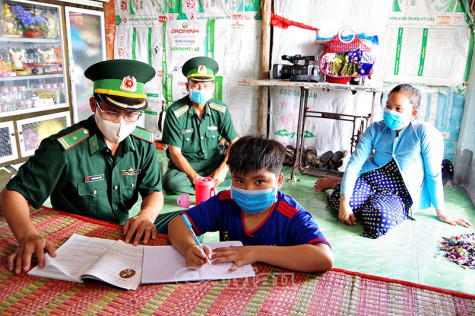 | Tổ công tác Đồn Biên phòng Tam Giang Tây thăm, kiểm tra việc học tập của cháu Chung Minh Khôi. |