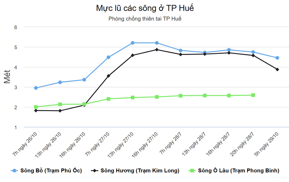 Mưa giảm, song lũ sông Hương, sông Bồ (Huế) xuống chậm, sông Vu Gia - Thu Bồn (Đà Nẵng) vẫn đang dao động ở mức cao và sông Trà Khúc (Quảng Ngãi) đang lên. Lúc 5h hôm nay, lũ sông Bồ tại Phú Ốc (Huế) xuống dưới báo động ba 0,05 m sau khi tăng nhẹ lên trên báo động ba 0,28 m vào 16h hôm qua. Sông Hương tại Kim Long trên báo động ba 0,37 m, giảm 0,81 m.