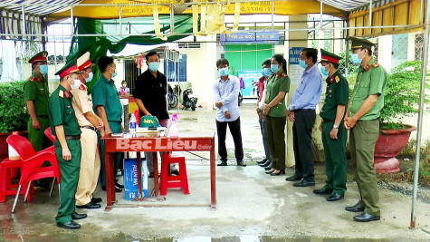 Lực lượng quân sự và Công an huyện Vĩnh Lợi phối hợp làm nhiệm vụ tại chốt kiểm soát phòng, chống dịch COVID-19. Ảnh: Văn Mẫn