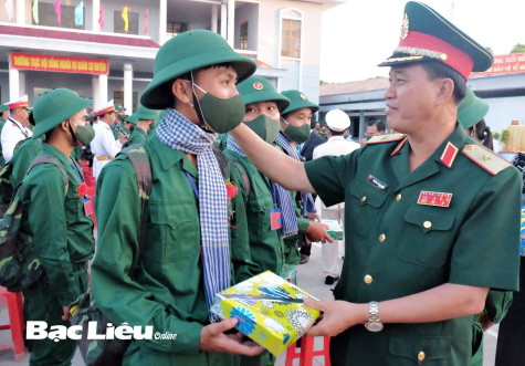 Thiếu tướng Trương Minh Khải - Phó Tư lệnh, Tham mưu trưởng Quân khu 9 tặng quà, động viên thanh niên huyện Hòa Bình lên đường nhập ngũ.