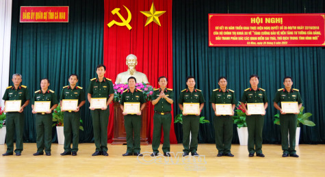 Dịp này, Đảng uỷ Bộ Chỉ huy Quân sự tỉnh tặng giấy khen cho 9 tập thể và 14 cá nhân có thành tích xuất sắc trong thực hiện Nghị quyết 35-NQ/TW. Ảnh: Đại tá Nguyễn Thanh Phong, Tỉnh uỷ viên, Phó Bí thư Đảng uỷ, Chính uỷ Bộ Chỉ huy Quân sự tỉnh trao giấy khen cho các tập thể và cá nhân.
