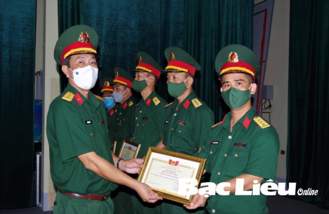 Đại tá Đỗ Minh Đẩu - Chỉ huy trưởng Bộ CHQS tỉnh trao thưởng cho tập thể, cá nhân có thành tích xuất sắc trong thực hiện phong trào thi đua quyết thắng năm 2021. Ảnh: Văn Đông