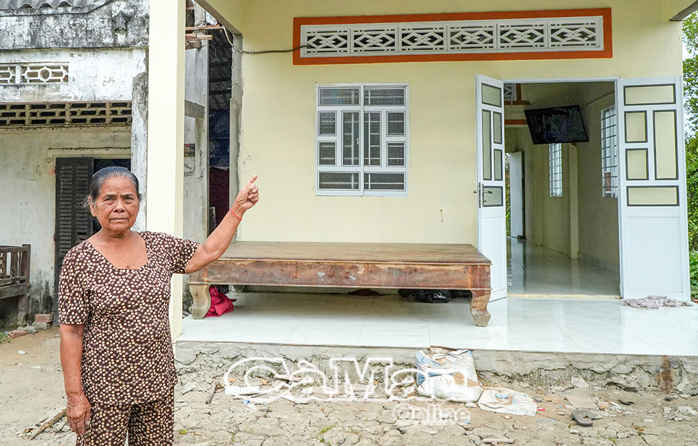 Bà Cao Thị Phước (76 tuổi), ở ấp Vĩnh Lộc, xã Phước Long, phấn khởi bên ngôi nhà mới khang trang được xây dựng từ nguồn kinh phí Nhà nước hỗ trợ 60 triệu đồng.