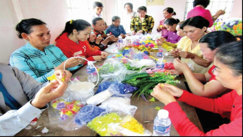 | Lớp dạy nghề kết cườm hoa của CLB Phụ nữ khuyết tật xã Tân Bằng. |