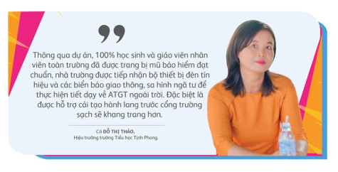 Là đơn vị phụ trách khâu tổ chức ngày hội An toàn giao thông năm nay, cô Đỗ Thị Thảo, Hiệu trưởng trường Tiểu học Tịnh Phong vui mừng khi sự kiện diễn ra tốt đẹp, mang đến những giây phút học tập, vui chơi thiết thực cho các em. Cô Thảo cho biết nhờ có dự án, 100% học sinh và giáo viên, nhân viên toàn trường đã được trang bị mũ bảo hiểm đạt chuẩn, nhà trường cũng được tiếp nhận bộ thiết bị đèn tín hiệu và các biển báo giao thông, sa hình ngã tư để thực hiện các tiết dạy về an toàn giao thông ngoài trời. Đặc biệt hơn cả là nhà trường đã được hỗ trợ ngân sách cải tạo hành lang trước cổng trường sạch sẽ khang trang hơn.