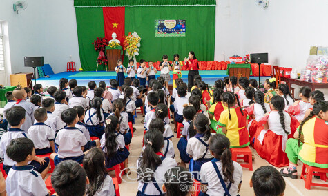 500 em thiếu nhi tại Trường Tiểu học Võ Văn Kiệt tham dự chương trình Trăng rằm Đất Mũi.
