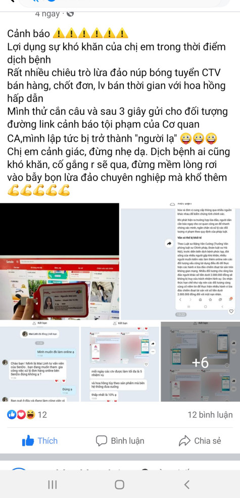 Dịch COVID-19 kéo dài, đời sống nhiều gia đình rơi vào khó khăn, các đối tượng đã lợi dụng hoàn cảnh, nhu cầu, sự nhẹ dạ cả tin của một bộ phận người dân để tạo nên bẫy tuyển cộng tác viên (CTV) online trên các sàn thương mại điện tử giả danh Shopee, Lazada, Tiki, Sendo… Chiêu trò gần đây tinh vi hơn khi các đối tượng sử dụng tài khoản mạng xã hội ảo để đăng tin, chạy quảng cáo công khai.