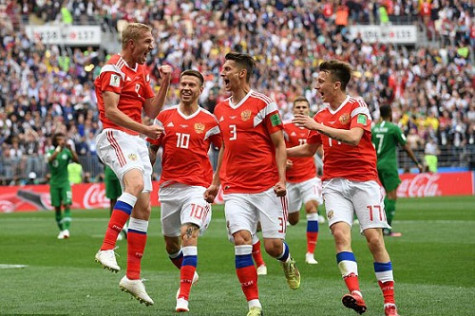 Trong thế trận cởi mở, ở phút 12 của trận đấu, từ pha được hưởng quả phạt góc, Golovin treo quả bóng chuẩn xác để Gazinsky bật cao đánh đầu hiểm hóc ghi bàn thắng đầu tiên của World Cup 2018 và giúp chủ nhà vượt lên. Chưa dừng lại ở đó, khi hiệp 1 bước sang phút 43, Cheryshev vào sân từ băng ghế dự bị đã có pha xử lý khéo léo, loại cả 2 hậu vệ đối phương, ghi bàn thắng nhân đôi cách biệt của tuyển Nga.
