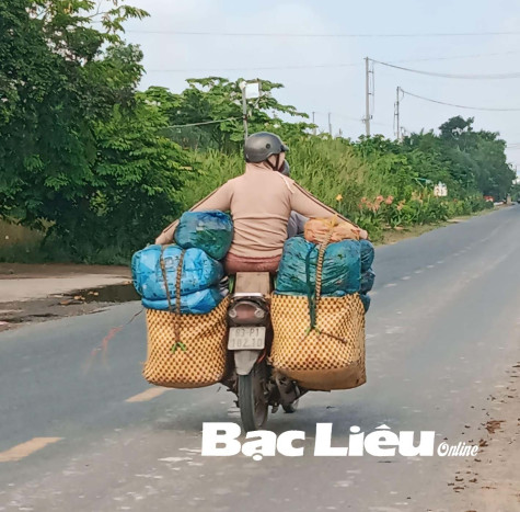 Trên một số tuyến đường từ các vùng ven TP. Bạc Liêu đến các chợ đầu mối, không khó để bắt gặp những chiếc xe máy được người dân tự ý trang bị giá đèo để chở thêm nông sản. Trên các giá đèo đơn sơ ấy, ngoài nông sản còn có cả những phụ nữ đi theo chuyến hàng - (ảnh).