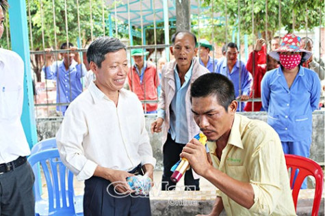 | Ông Nguyễn Văn Biên, Giám đốc Trung tâm Nuôi dưỡng người tâm thần tỉnh Cà Mau cùng các bệnh nhân trong giờ văn nghệ. |