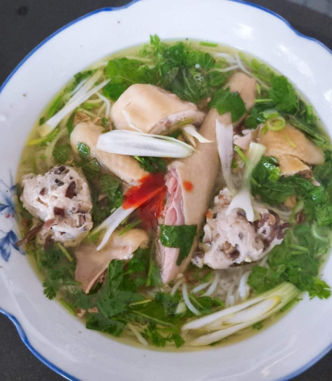 Tô bún nghi ngút khói, thịt gà ngọt cộng với chút giòn dai sần sật của mọc, nấm mèo, chút cay nhẹ của sa-tế... rất ngon miệng.
