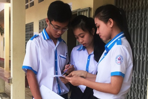 Thí sinh trao đổi về đề thi sau khi thi tại điểm thi C11 trường THPT Cái Nước. Ảnh: Thảo Nguyên