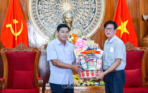 | Đồng chí Nguyễn Tiến Hải, Uỷ viên BCH Trung ương Đảng, Bí thư Tỉnh uỷ, Chủ tịch HĐND tỉnh Cà Mau nhận quà và lời chúc Tết từ tiến sĩ Phan Công Khanh, Giám đốc Học viện Chính trị khu vực IV. |