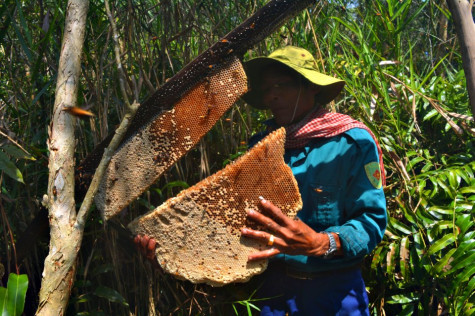 Trò chuyện một hồi, anh Chơn (Trần Văn Chơn), con trai út của ông Út Nhì, cũng là người được chọn nối nghiệp, đột nhiên phát lệnh: “Tới nơi rồi, chúng ta xuống ăn ong”. Cả đoàn cởi hết quần dài, chỉ mặc quần cụt bởi nước rừng lúc này còn khá sâu. 2 cha con ông đi đầu, chúng tôi hăng hái nối đuôi theo thành một hàng dài. Nói là hăng hái cho oai chứ thực ra chúng tôi ai cũng hồi hộp… sợ ong "đánh". Chỉ vào hướng tổ ong cho chúng tôi thấy, anh Chơn nói: “Cha chầm chậm đốt khói, để mấy anh chụp ảnh, ghi hình nguyên tổ ong xong rồi mình "ăn" luôn một thể”. Nghe thế anh em ai cũng phấn khởi bởi chắc cú sẽ có ảnh đẹp, thế nhưng, đây mới là tai hại. Anh Hưng lớn nhất trong đám tụi tôi dứt khoát: “Anh vào trước, mấy đứa vào sau nhé”. Ừ, thì để anh vào trước. Tụi tôi đứng ngoài đang bàn cách nào khi ông Út Nhì cắt tổ ong xuống, anh em phải có được tấm ảnh đẹp, độc về nghề rừng, bỗng thấy cái bóng ở trong chạy ra la lớn: “Nó đánh anh rồi, đi, đi thôi, lấy ổ khác đi!”. Liền lúc đó ong ở đâu túa ra đen ngòm, bu quanh chúng tôi. Anh Chơn la lớn: “Nhanh, nhanh, đốt khói lên cha ơi”. Ông Út Nhì nhanh chóng lấy cục sáp ong chuẩn bị sẵn để trên đầu cây cúi, bật lửa đốt. Khói bay lên, ong dãn ra, cả nhóm mỗi đứa đã "dính" vài vết kim.