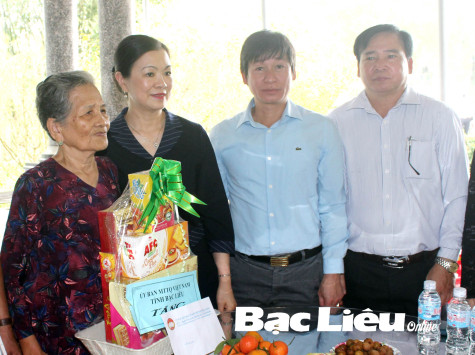 Bà Trương Thị Ngọc Ánh - Phó Chủ tịch Ủy ban Trung ương MTTQ Việt Nam (thứ hai từ trái sang) tặng quà cho Bà mẹ Việt Nam anh hùng - Trịnh Thị Huế (ấp Vĩnh Bình B, xã Vĩnh Thanh, huyện Phước Long).
