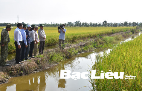 Lãnh đạo tỉnh thị sát mô hình lúa - tôm ở xã Ninh Hòa (huyện Hồng Dân). Ảnh: M.Đ