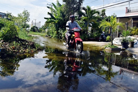 | Tuyến lộ khu dân cư đường Lương Thế Trân 5 cùng nhiều hộ dân Khóm 8, Phường 8 luôn trong tình trạng ngập nước vào mùa mưa. |