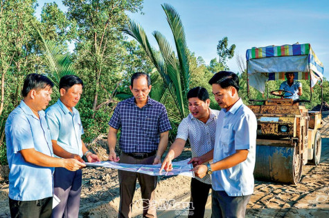 | Ðồng chí Nguyễn Chí Thiện (đứng giữa), Bí thư Huyện uỷ Ðầm Dơi, kiểm tra tiến độ thi công các công trình hạ tầng giao thông nông thôn trên địa bàn huyện từ vốn đầu tư công năm 2022. |