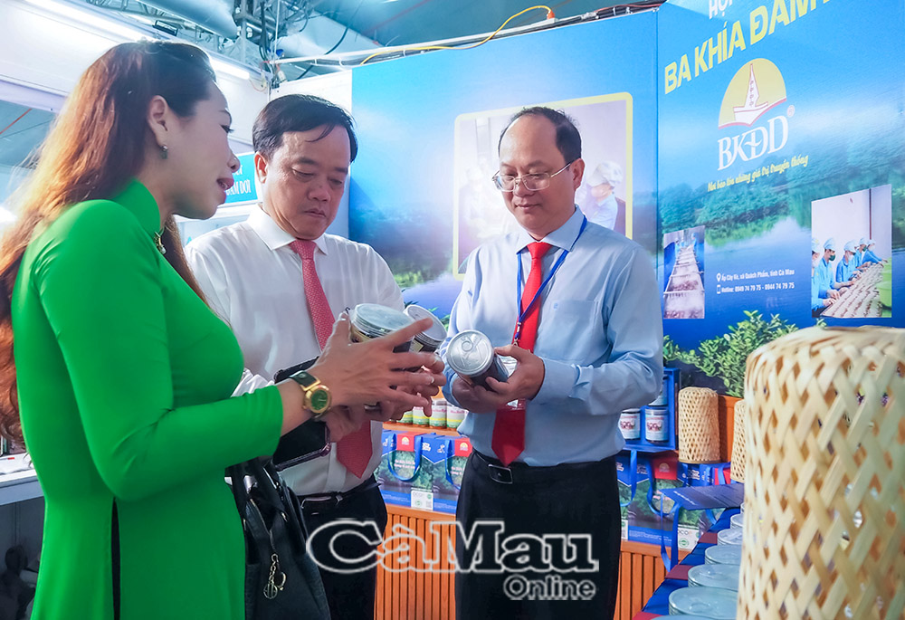 Bí thư Tỉnh uỷ Nguyễn Hồ Hải cùng đồng chí Huỳnh Quốc Việt, Uỷ viên dự khuyết Ban Chấp hành Trung ương Đảng, Phó Bí thư Thường trực Tỉnh uỷ, Chủ tịch Uỷ ban Mặt trận Tổ quốc Việt Nam tỉnh, tham quan gian hàng HTX Ba khía Đầm Dơi.