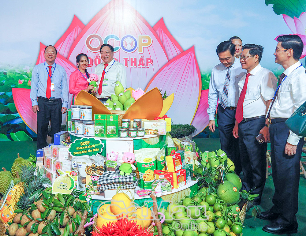 Đoàn tham quan, chụp ảnh lưu niệm tại gian hàng trưng bày sản phẩm tỉnh Đồng Tháp.