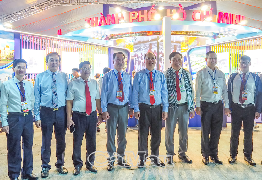 Đoàn chụp ảnh lưu niệm tại gian hàng trưng bày của Thành phố Hồ Chí Minh.