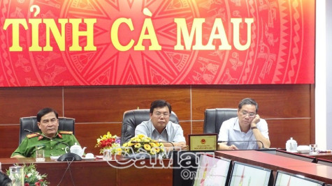 Chủ tịch UBND tỉnh Cà Mau Nguyễn Tiến Hải (giữa) chủ trì hội nghị tại điểm cầu Cà Mau