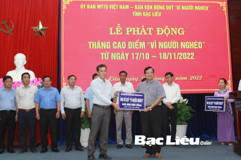 Đồng chí Nguyễn Văn Hòa - Trưởng Ban Dân vận Tỉnh ủy, Chủ tịch Ủy ban MTTQ Việt Nam tỉnh (bên phải) tiếp nhận kinh phí ủng hộ Quỹ Vì người nghèo năm 2022.