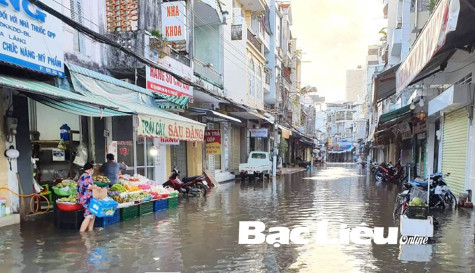 Triều cường dâng cao gây ngập ở một số tuyến đường nội ô TP. Bạc Liêu. Ảnh: C.L