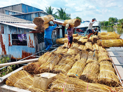 | Sông ngòi chằng chịt, một số nơi xe tải chưa đến nơi nên phải vận chuyển năn tượng khô bằng ghe. |